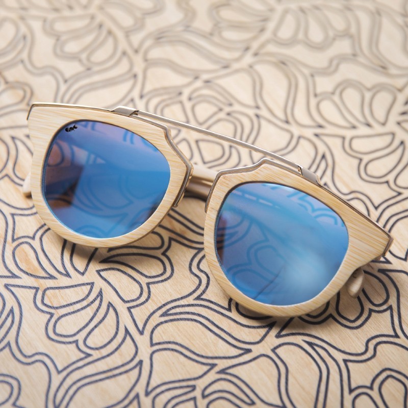 • Occhiali realizzati e assemblati a mano con legno di bambù, metallo dorato e cristalli organici blu.