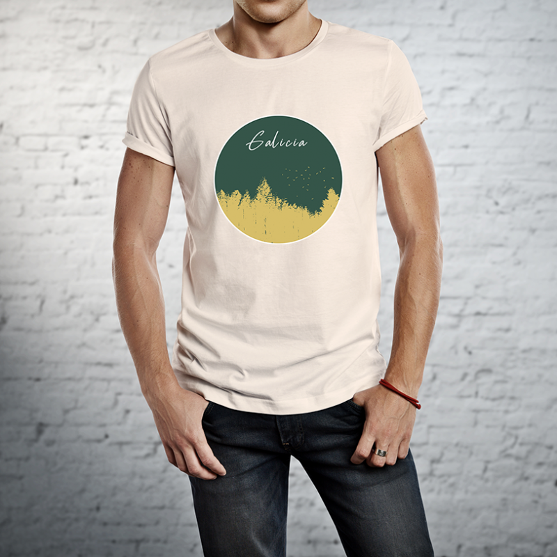 T-shirt met een speciaal, fris en anders zeer origineel ontwerp als eerbetoon aan de branden die plaatsvonden in Galicië waar duizenden vuren werden gestookt. In deze illustratie ziet u een Galicisch bos van wilgen en berken, een typische en overvloedige boom in Galicië.